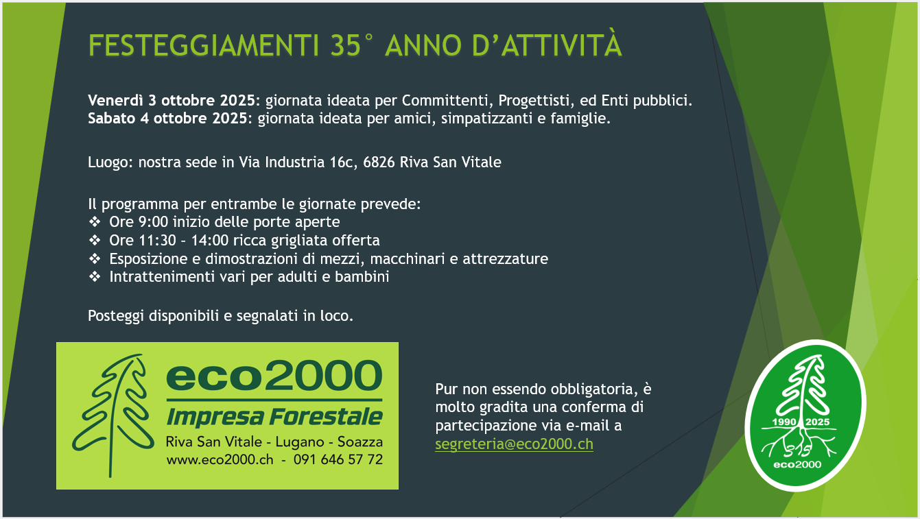 Eco2000 celebra un traguardo importante: 35 anni di attività al servizio del territorio. Per l’occasione, l’azienda apre le porte della sua sede di Riva San Vitale con due giornate dedicate a clienti, partner, amici e famiglie.